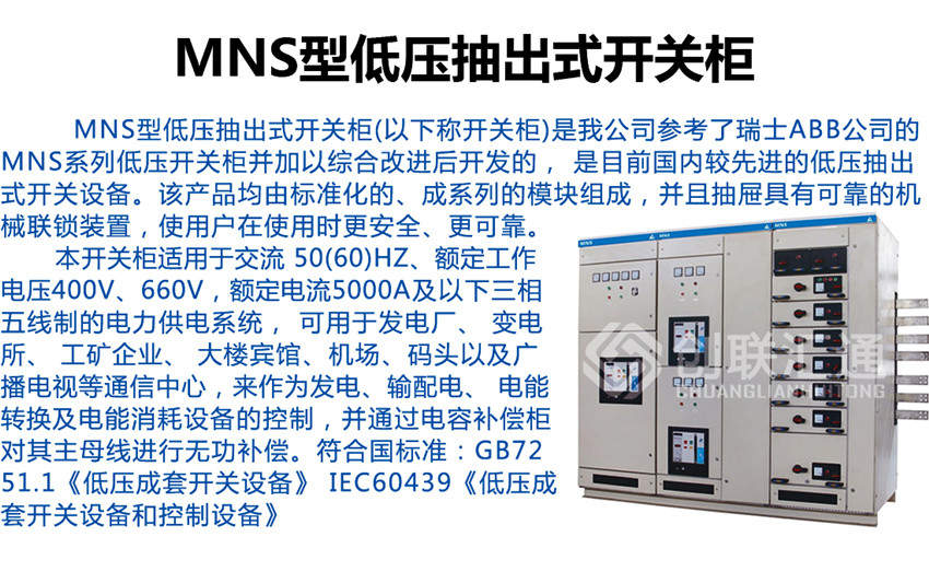 MNS型低壓抽出式開關(guān)柜適用于發(fā)電廠、變電站、石油化工、冶金軋鋼、輕工紡織等廠礦企業(yè)和住宅小區(qū)、高層建筑等場(chǎng)所,作為交流50~60Hz,額定工作電壓交流660V及以下的電力系統(tǒng)的配電設(shè)備的電能轉(zhuǎn)換、分配及控制之用。