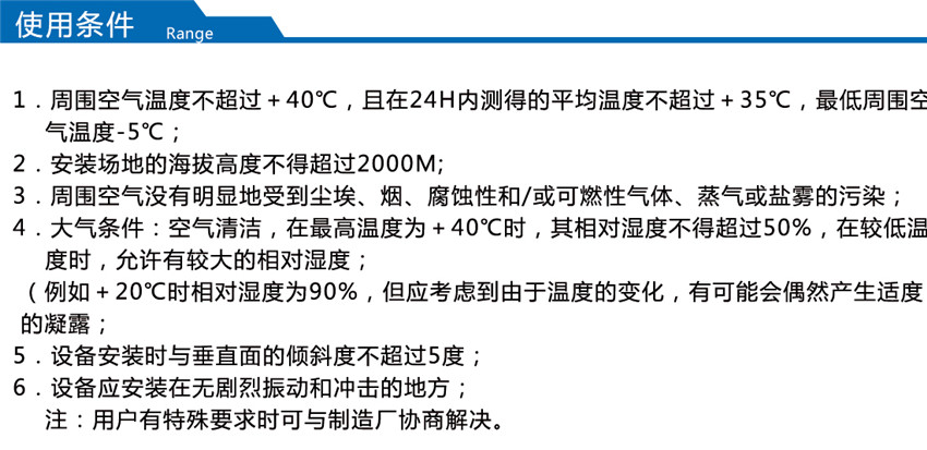 2. 大氣條件:空氣清潔,相對(duì)濕度在最高溫度+40℃時(shí)不超過50﹪;在較低溫度時(shí)允許有較高的相對(duì)濕度,例如20℃時(shí)為90﹪,但應(yīng)考慮到由于溫度的變化,有可能會(huì)偶然地產(chǎn)生適度的凝露。