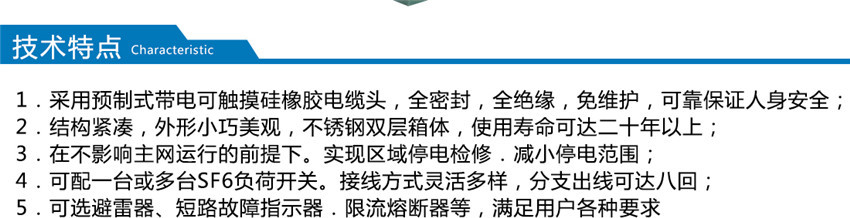 以其優良的性能,規范化的設計,優美的外觀,廣泛應用于電纜配電網系統中的電纜化工程設備,在各大工業園區,居民小區,城市人口密集區,商業中心以及高層建筑等各種場所得到普遍認同。它以單向開門、橫向多通母排為主要特點,具有寬度小、組合靈活、全絕緣、全密封等顯著優點。按照額定電流一般可以分為600A主回路和200A支回路兩種。600A主回路采用旋入式螺栓固定連接;200A分支回路采用拔插式連接,且可以帶負荷拔插。