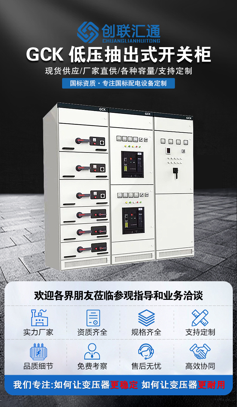 G-GCK型低壓抽出式開關柜,適用于三相交流50-60HZ,額定工作電壓為380V,額定電流400及以下三相四線制及三相五線制電力系統廣泛應用于發電廠、變電站、工礦企業、大樓賓館、機場、碼頭以及廣播電視等通信中心,輸配電、電能轉換及電能消耗的動力配電中的PC和電動機控制中心MCC。