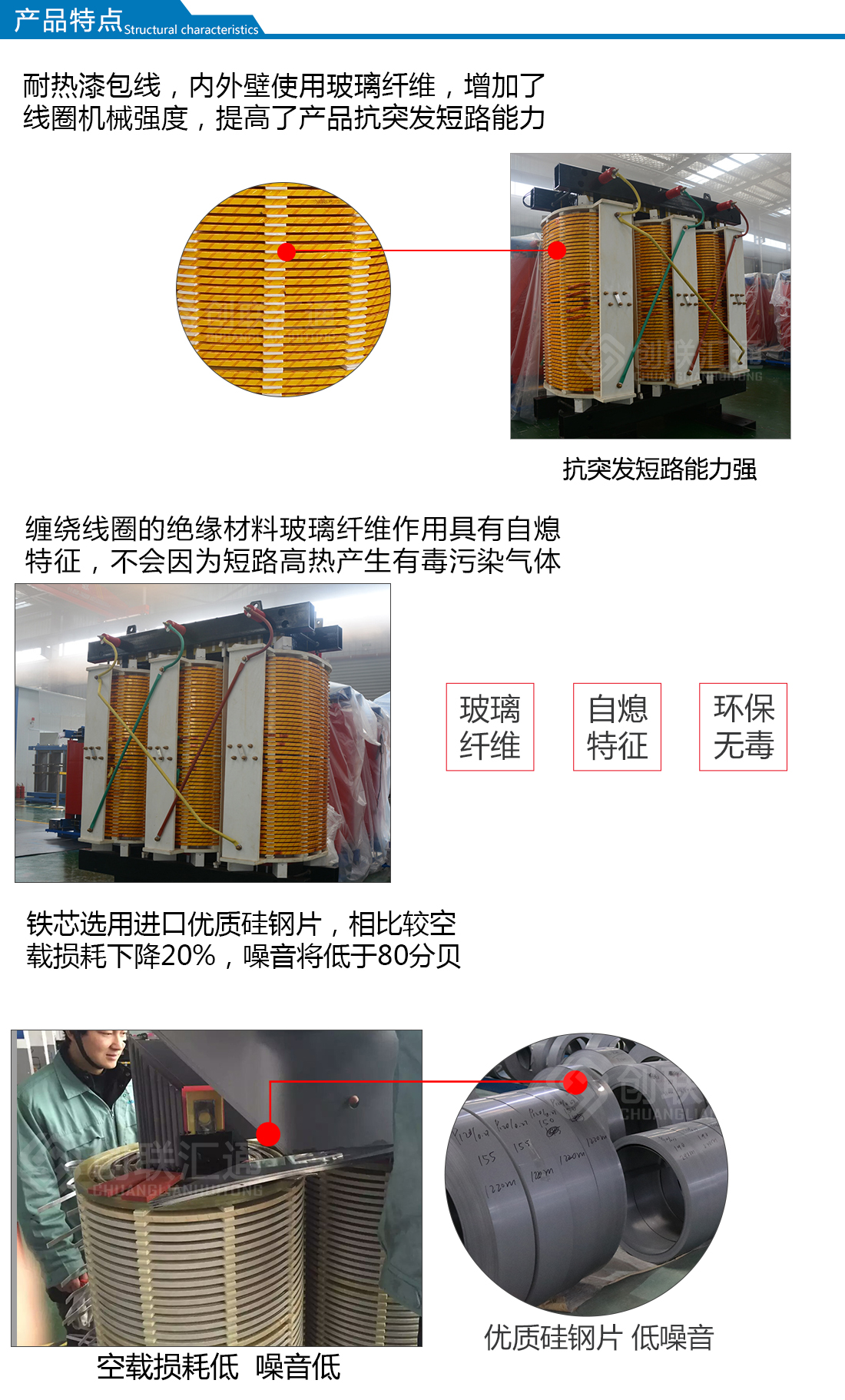 SG(B)10系列H級絕緣干式變壓器采用優質環保材料,先進的生產檢測設備按嚴格的工藝生產而成,具有高性能、高安全、承受熱沖擊能力強等特點,它適用于防火要求高、負荷波動大以及污穢潮濕的惡劣環境中。如:高層建筑、商業中心、住宅小區、醫院、化工廠、核電站、船舶及其它安全性要求防火、防爆、防潮的配電網絡與工礦企業供配電系統等重要或特殊環境場所。