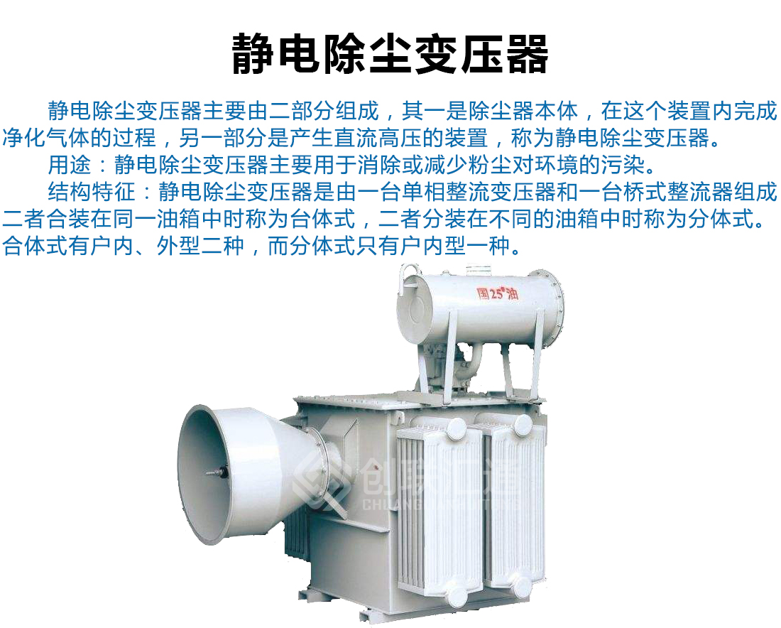 靜電除塵變壓器是由一臺單相整流變壓器和一臺橋式整流器組成。二者合裝在同一油箱中時稱為臺體式,二者分裝在不同的油箱中時稱為分體式。合體式有戶內、外型二種,而分體式只有戶內型一種?! ∽儔浩髯陨頌楦咦杩棺儔浩?。高壓硅堆采用雪崩高壓硅堆,抗沖擊能力強,反向擊穿后能自動恢復。采樣電阻采用可靠性很高的產品。變壓器高壓交流端與高壓硅堆采用全橋接線方式。