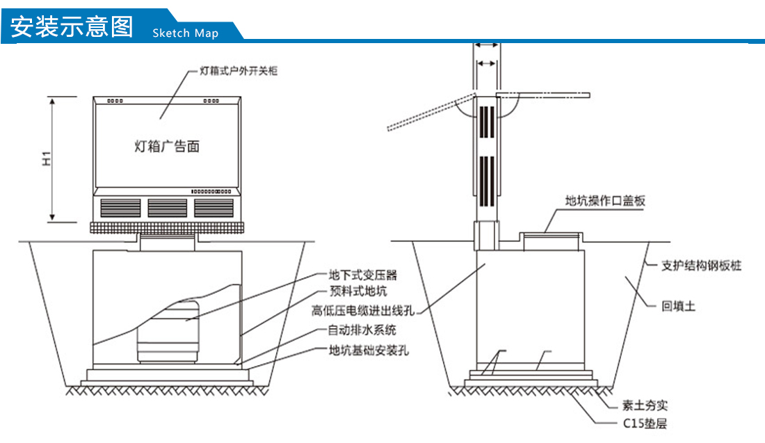 變壓器和高低壓柜等設備置入全地埋箱體內埋入地下,保證地面無噪音干擾。