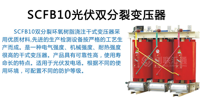 SCFB10雙分裂環(huán)氧樹(shù)脂澆注干式變壓器采用優(yōu)質(zhì)材料,先進(jìn)的生產(chǎn)檢測(cè)設(shè)備按嚴(yán)格的工藝生產(chǎn)而成。是一種電氣強(qiáng)度、機(jī)械強(qiáng)度、耐熱強(qiáng)度很高的干式變壓器。產(chǎn)品具有可靠性高,使用壽命長(zhǎng)的特點(diǎn)。適用于光伏發(fā)電場(chǎng)。根據(jù)不同的使用環(huán)境,可配置不同的防護(hù)等級(jí)。